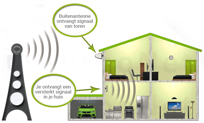 - De signaalversterker mobiele telefoon bestaat uit een buiteneenheid (een directionele antenne) die het signaal uit de lucht opspoort en ontvangt. Deze signalen zijn veel minder sterk en ze zijn voor een mobiele telefoon zeer moeilijk te vinden. De reden hiervoor is dat een hele kleine antenne is ingebouwd in het mobiele toestel. De buitenantenne is veel groter en in staat om het signaal, dat niet door een mobiele telefoon gevonden kan worden, snel te ontvangen.